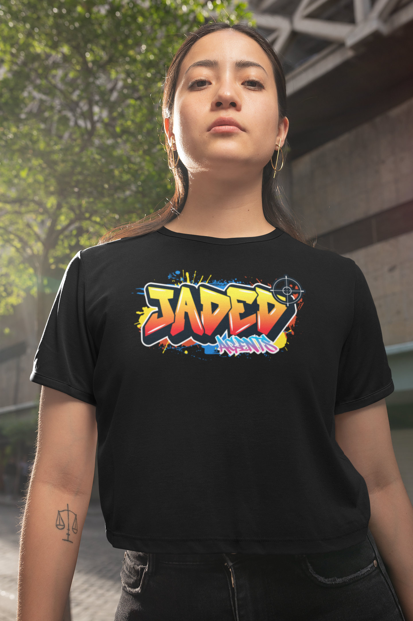 'Crazy Train' Crop Tshirt—Splashed with bright-colored graffiti against a deep black canvas, this hoodie captures the raw energy of street art. Crafted from high-quality materials.
