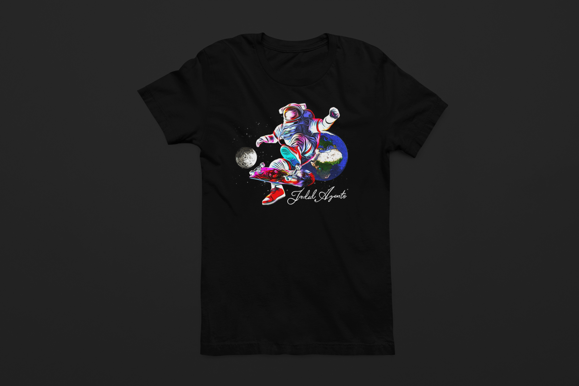 Defy gravity with our 'Ground Control' t-shirt! Featuring an astronaut skating through space, this tee captures the thrill and exploration of skateboarding like never before. Whether you're a seasoned skater or an intergalactic enthusiast, this unique design is sure to turn heads. Crafted from premium quality materials, it offers both comfort and style for your everyday adventures. Join the cosmic ride and make a statement with 'Ground Control.'